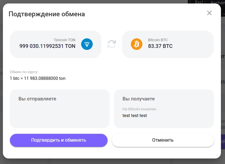 Данное модальное окно необходимо, чтобы клиент ознакомился с указанными им данными для совершения обмена.