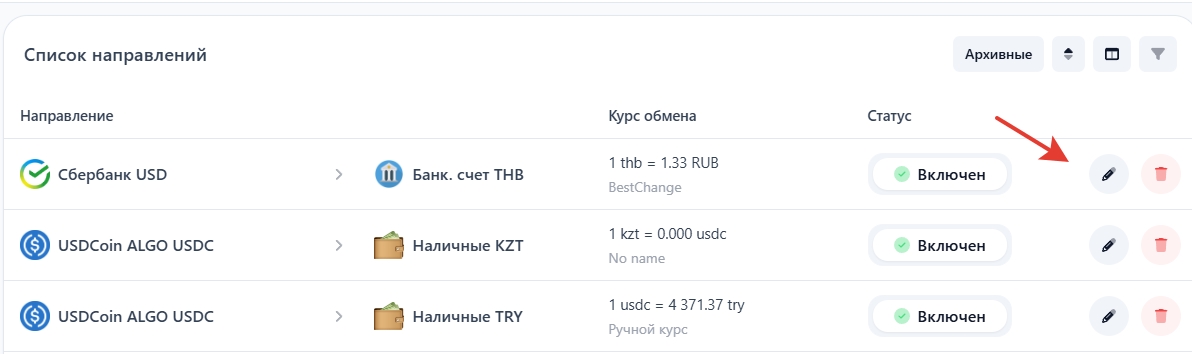 В панели управления откройте раздел "Основное — Направление обмена — Список направлений", выберите направление и перейдите к редактированию.