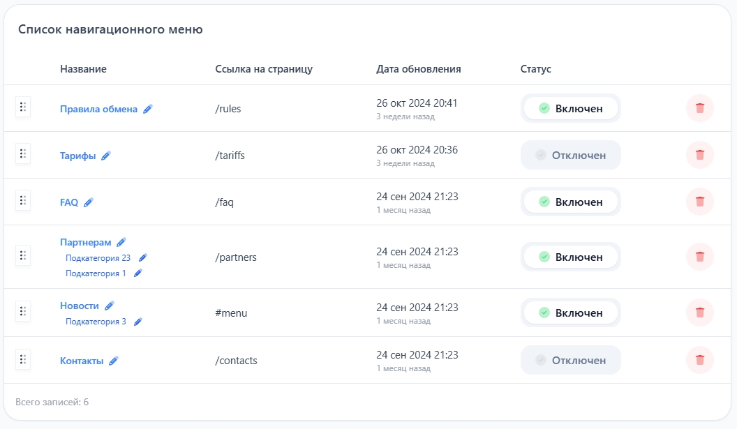 Навигационное меню — это удобный список ссылок на важные страницы обменника, с помощью которого пользователи могут быстро найти нужную информацию. Вы можете создавать простые разделы меню (например, «Контакты», «Правила обмена») или разделы с подкатегориями (например, «Информация», в котором будут подразделы «О нас», «Отзывы», «Новости»).