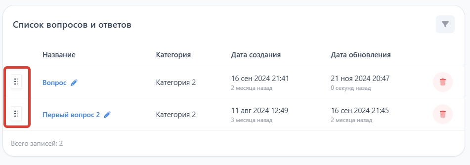 Для сортировки вопросов и ответов нажмите на иконку рядом с название и перемещайте.