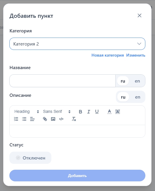 Для добавления новой записи нажмите кнопку "Добавить пункт"