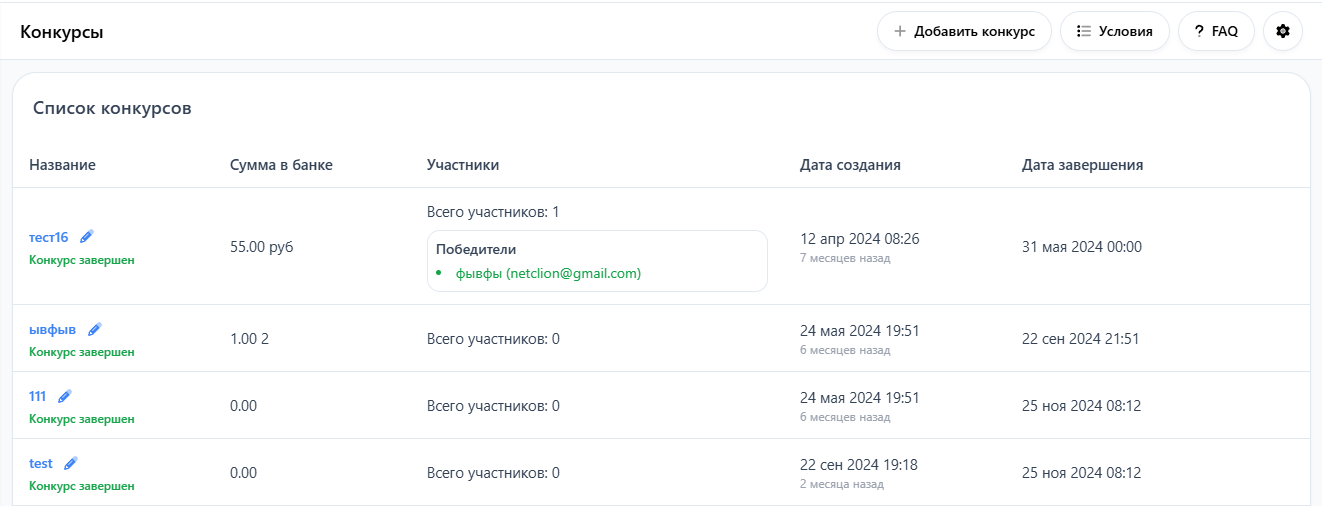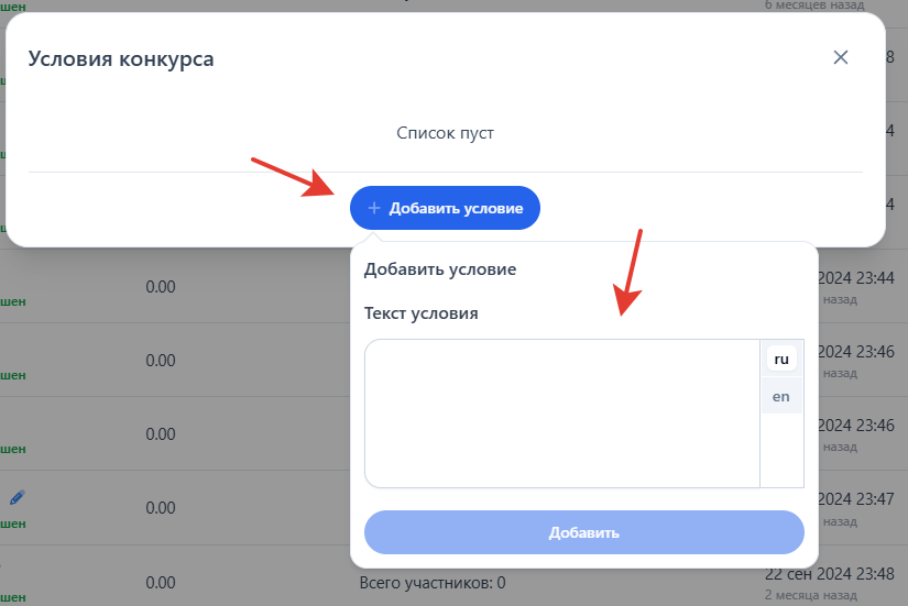 Чтобы добавить новый конкурс, нажмите кнопку "Добавить конкурс"