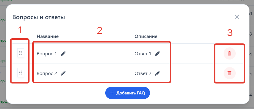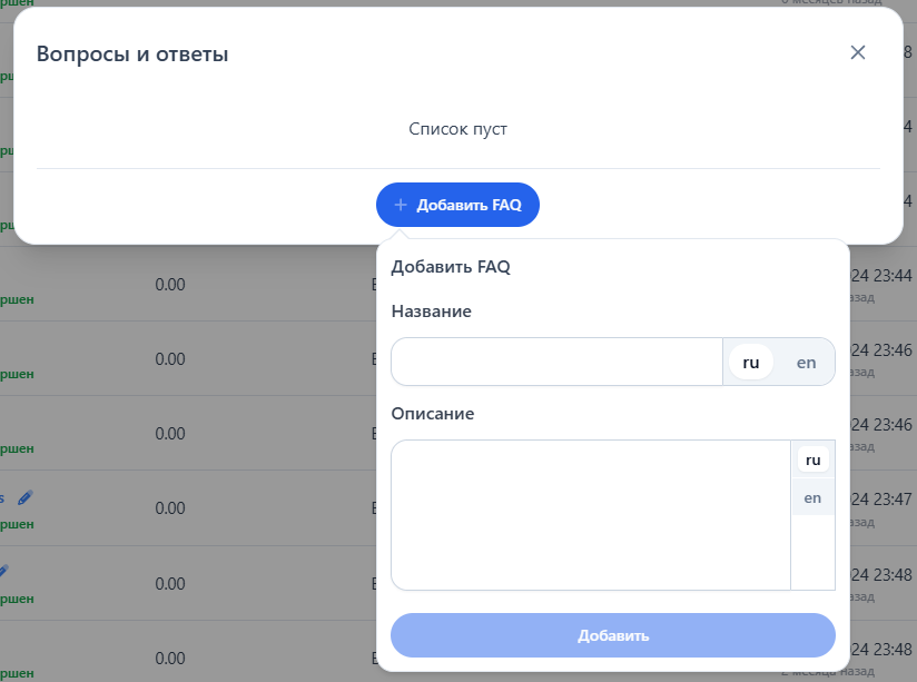 На открывшейся окне, нажмите на кнопку "Добавить FAQ" и заполните представленные поля