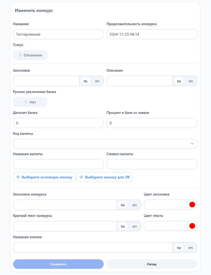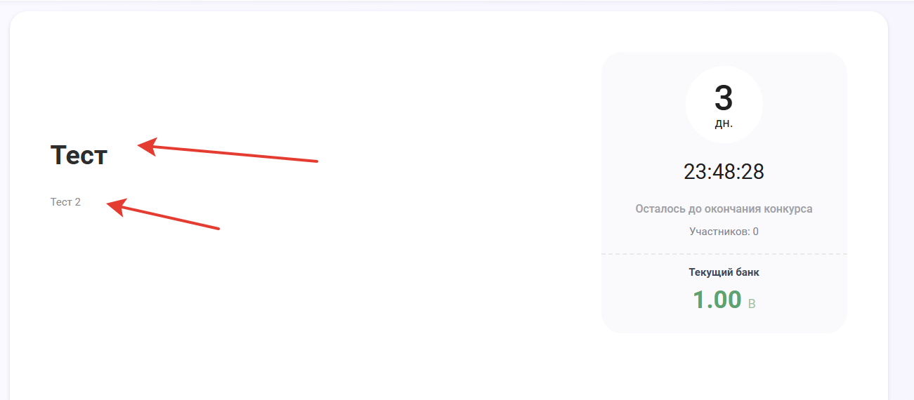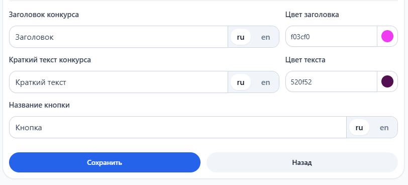 Заголовок конкурса — Укажите заголовок конкурса которая будет отображаться на главной странице