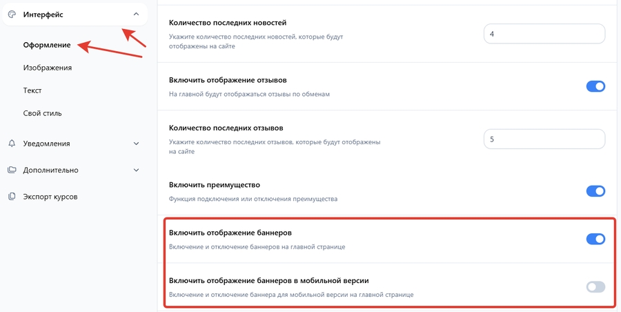 Если после настройки баннеров, они не отображаются на сайте, перейдите в "Настройки — Настройки оформления"