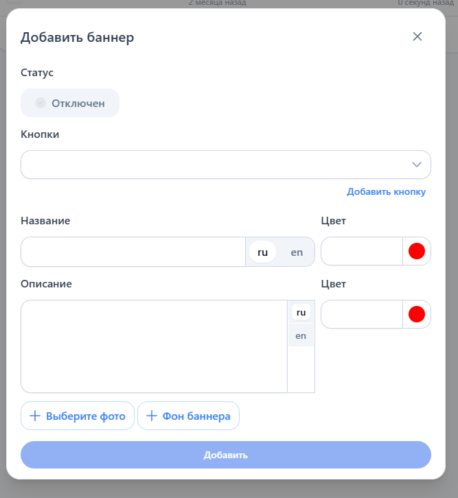 Кнопки — выберите кнопки, которые будут привязаны к баннеру (Если нет, нажмите кнопку "Добавить кнопку")