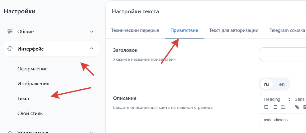 Откройте раздел "Текст" и перейдите во вкладку "Приветствие"