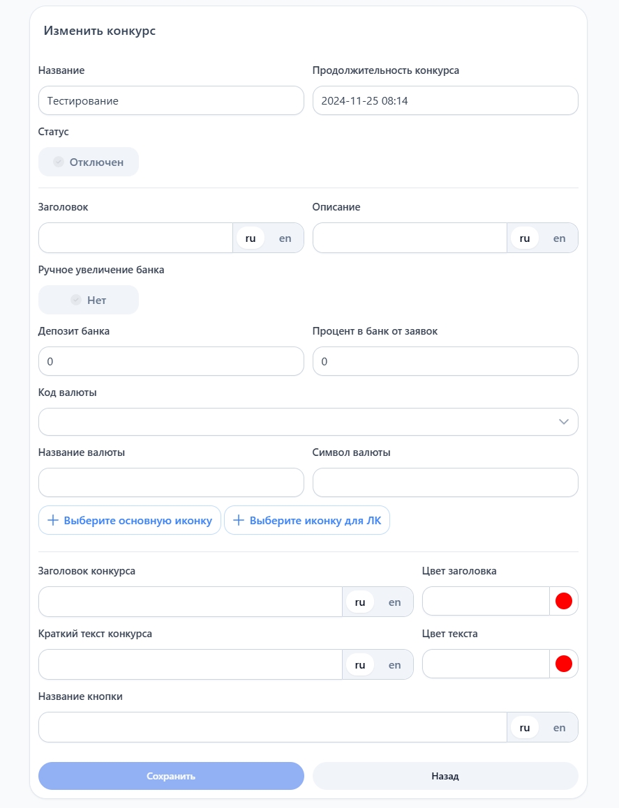 После добавления, вы будете переадресованы на страницу настроек созданного конкурса