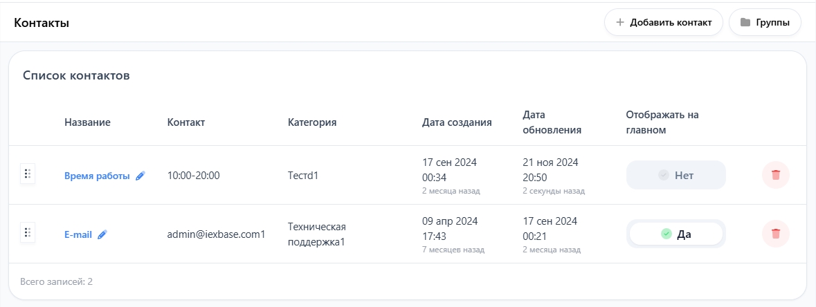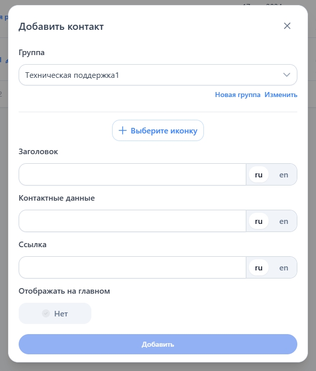 Отображать на главном — если хотите, вывести контакт в шапке сайта на всех страницах, выберите "Да"