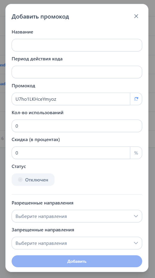 Если вы не выбрали направления в "Разрешенные направления" или "Запрещенные направления", то промокод будет доступен для всех направлений