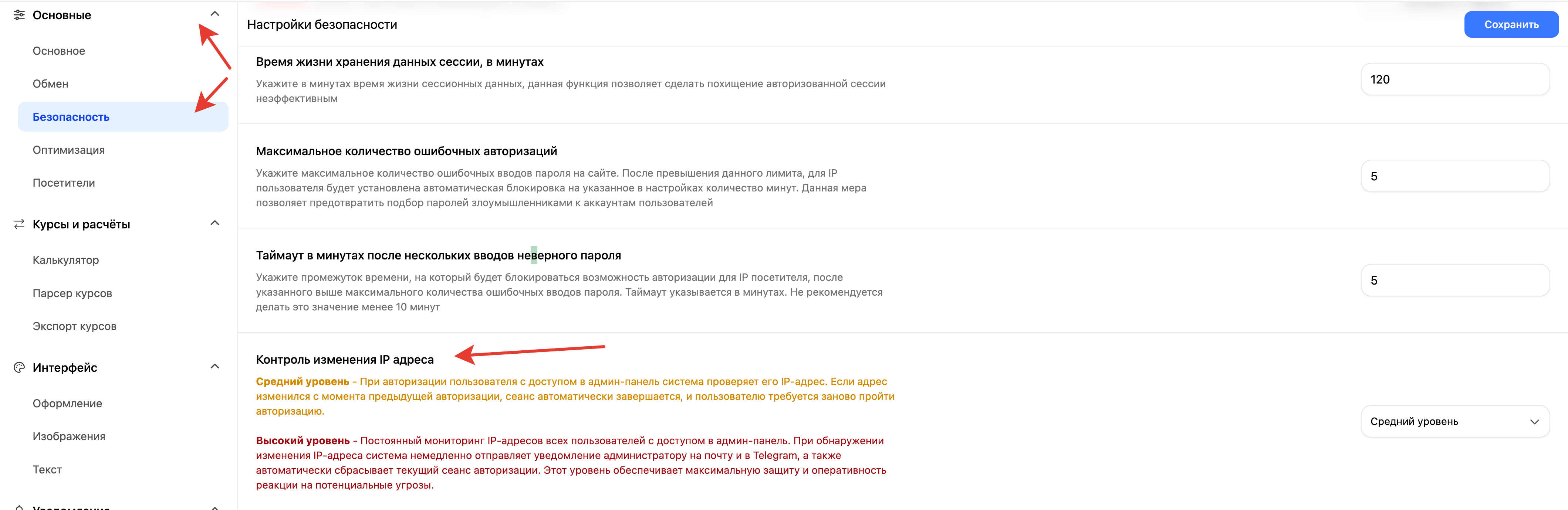 Для усиленной защиты панели управления рекомендуется использовать данную настройку совместно с контролем изменения IP-адреса. В связке эти параметры значительно повышают уровень безопасности и контроля административных сессий.