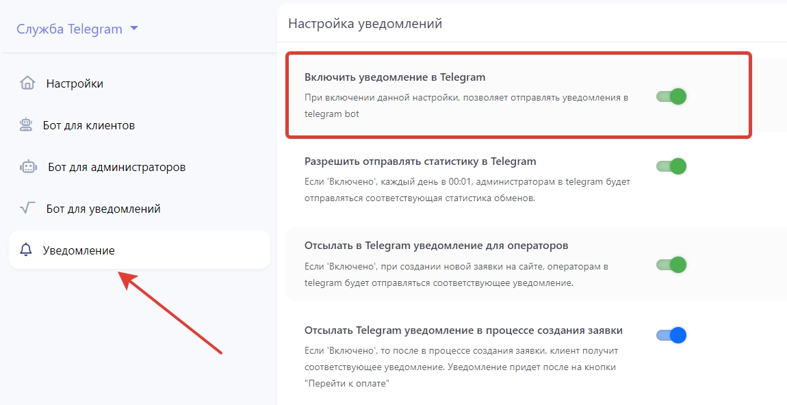 Во вкладке "Уведомление", включите "Включить уведомление в Telegram"