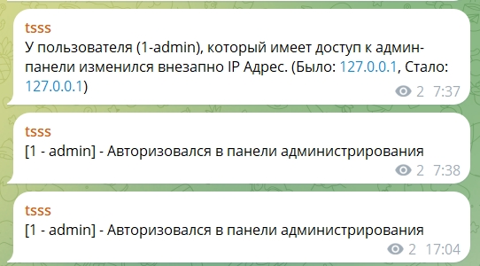 Если все правильно настроено, при каждом входе в панель администрирования, в Telegram будут приходить уведомления.