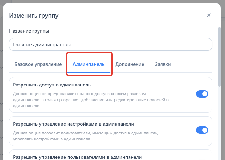 Перейдите на вкладку «Админпанель».