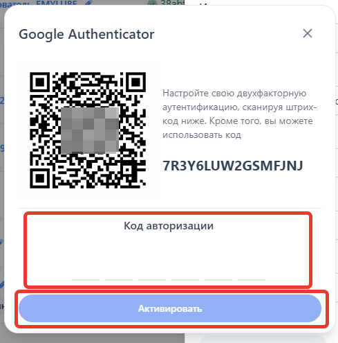 Если вы ещё не активировали Google Authenticator, получите код и QR-код, чтобы отсканировать их в приложении.