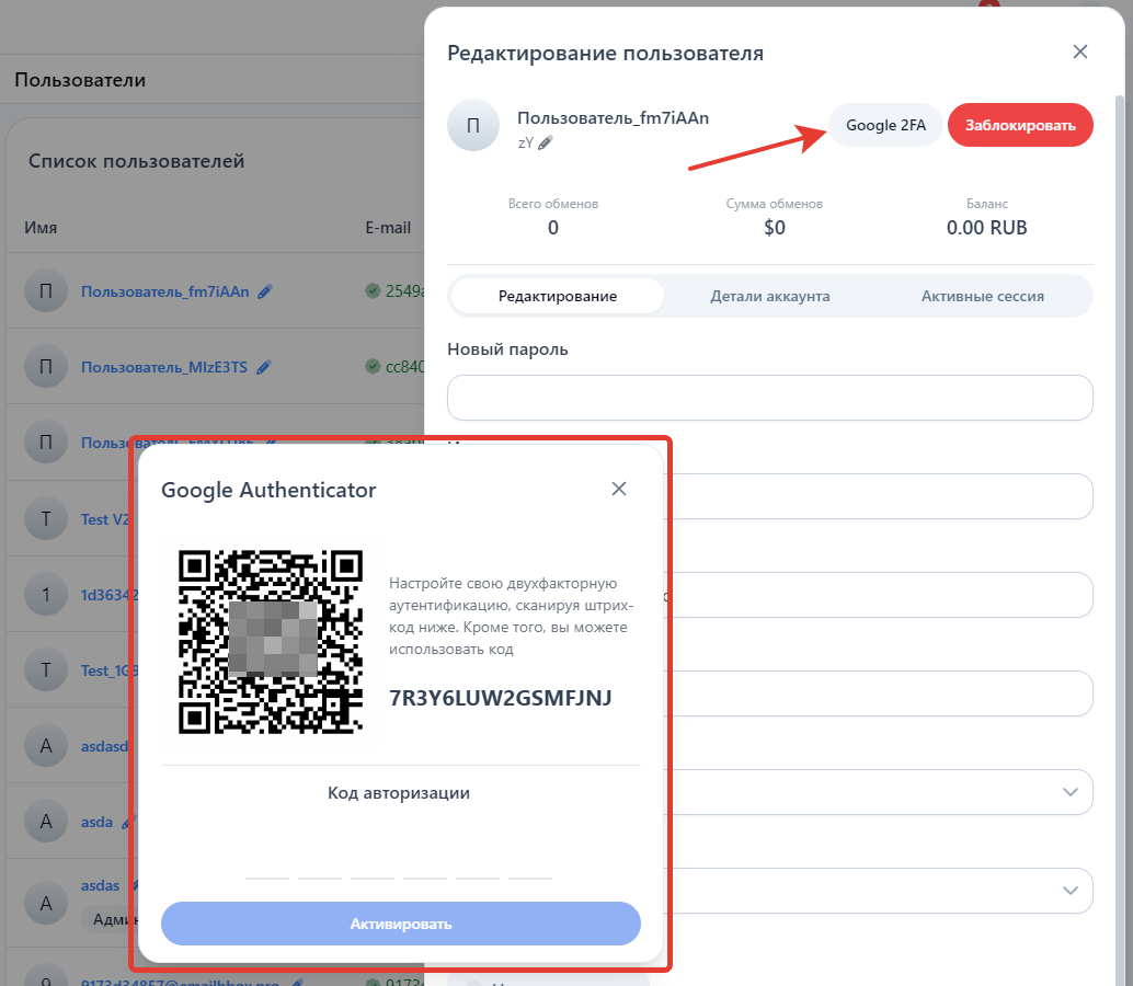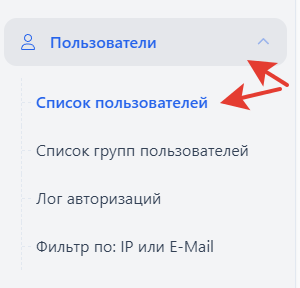 Для активации кода безопасности Google Authenticator перейдите в панели управления в раздел «Пользователи → Список пользователей».