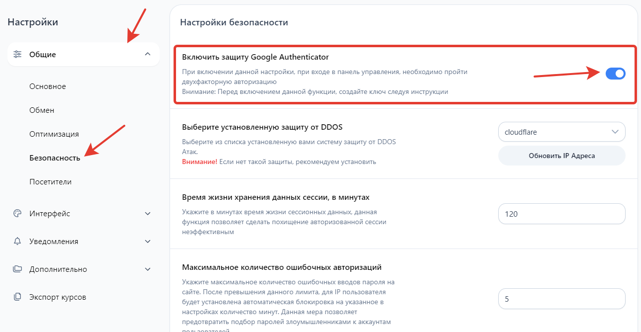 В панели управления перейдите в раздел «Настройки → Общие настройки», откройте вкладку «Безопасность» и активируйте опцию «Включить защиту Google Authenticator».