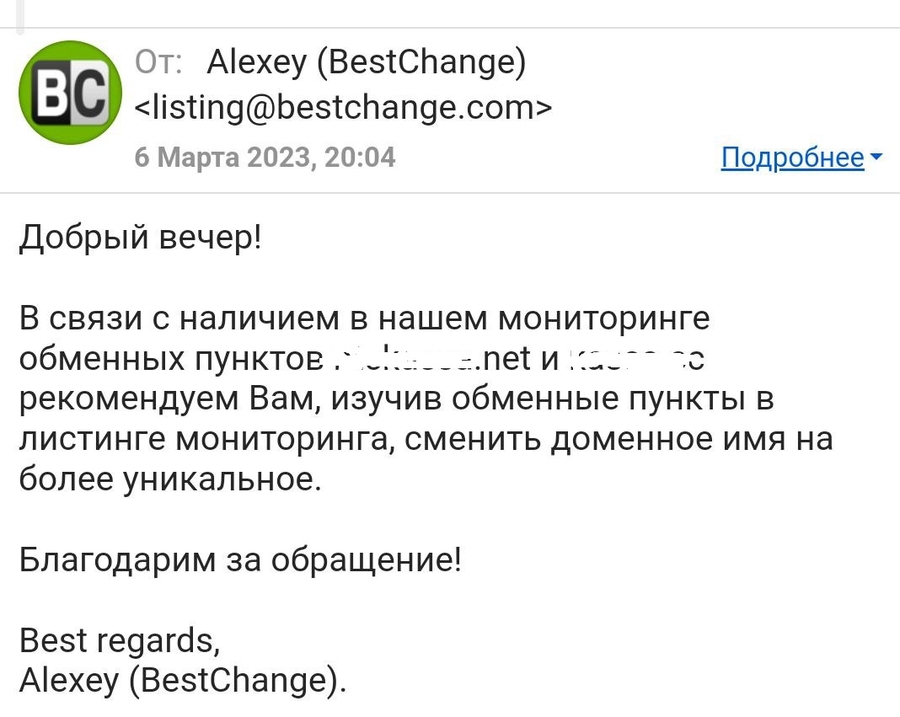 Администрация мониторинга BestChange внимательно проверяет названия доменов при рассмотрении заявок и не принимает обменные пункты, которые используют доменные имена, сходные с названиями уже существующих популярных сервисов или обменников.