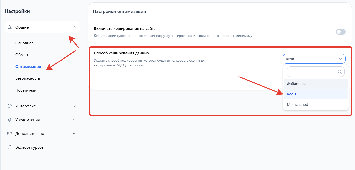 Способ кеширования данных — выберите из списка вариант кеширования "Redis"