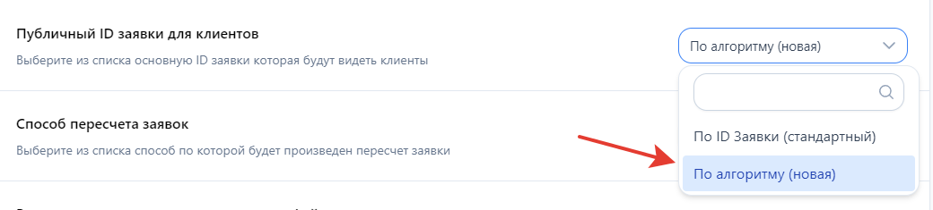Публичный ID заявки для клиентов — Выберите любой из доступных вариантов. (Я выберу: "По алгоритму (новая)")