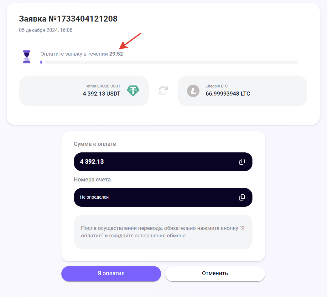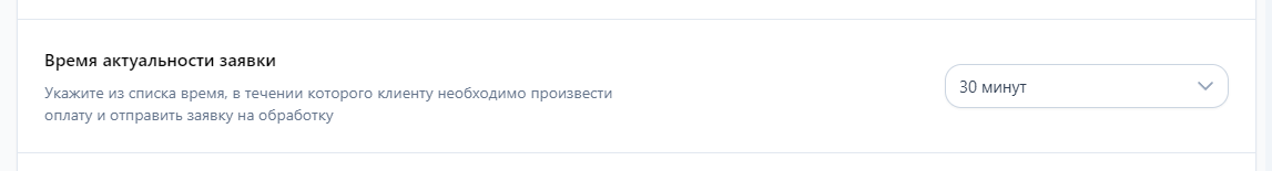 Время актуальности заявки — время, в течении которого клиенту необходимо перевести средства на указанные реквизиты и нажать кнопку "Я оплатил"