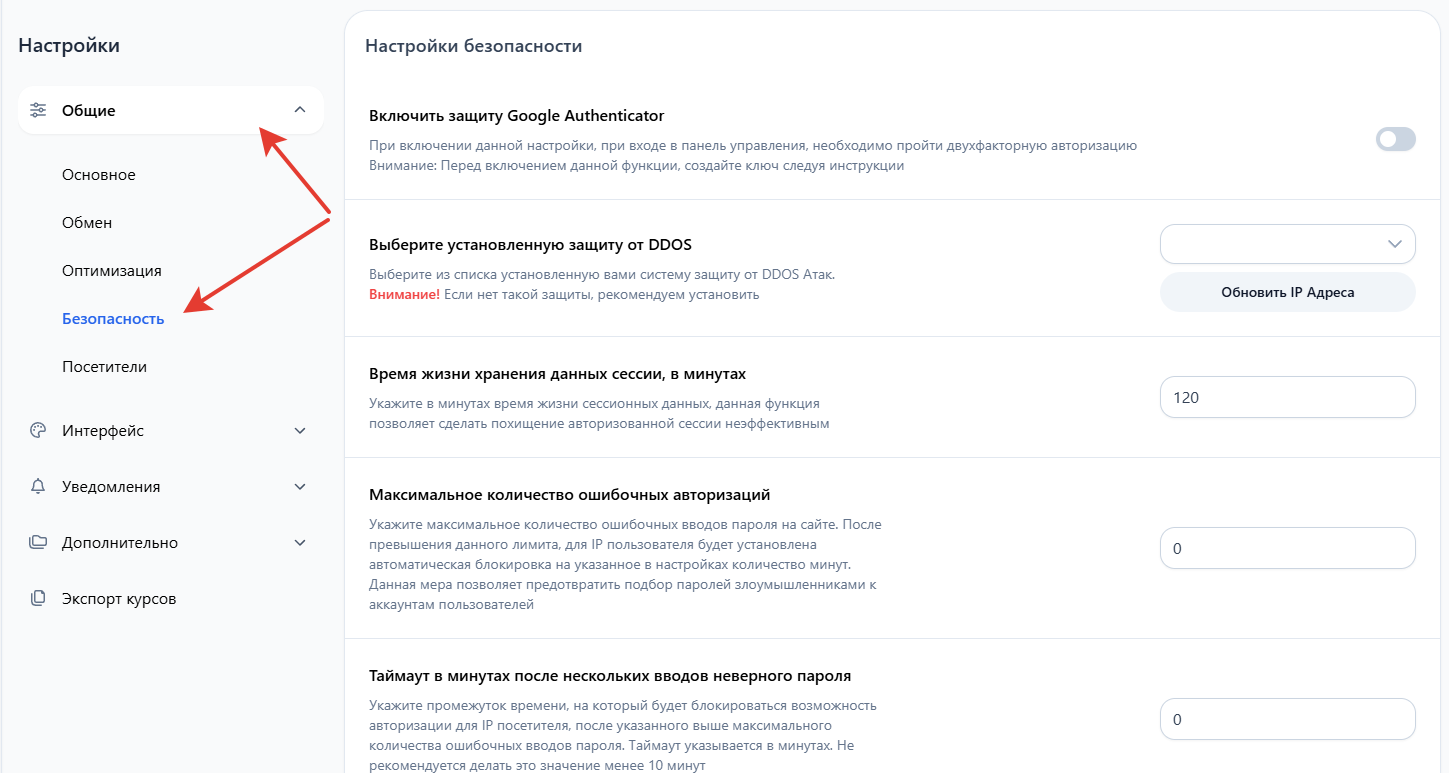 Настройки данного раздела помогут обеспечить защиту вашего обменного пункта. Пока рекомендуем настроить только базовые параметры, более детальные настройки можно выполнить позднее.