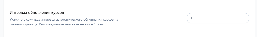 Интервал обновления курсов — Одна из самых важных функций, настроить которую необходимо обязательно. Эта функция обновляет данные в фоновом режиме на главной странице, что позволяет держать курсы актуальными. (Расчет в секундах)
