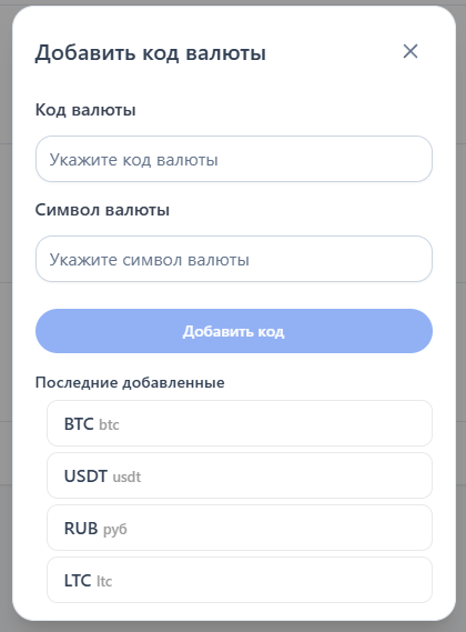 Код валюты — Укажите название кода (Например: BTC или USDT)