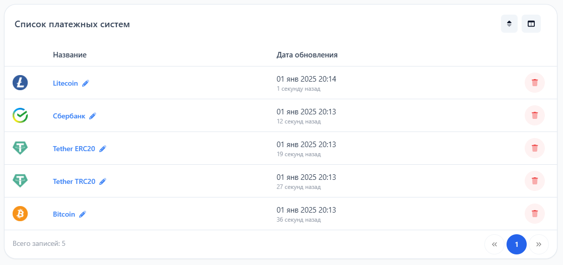 Теперь для примера создадим несколько платежных систем, пусть это будет: