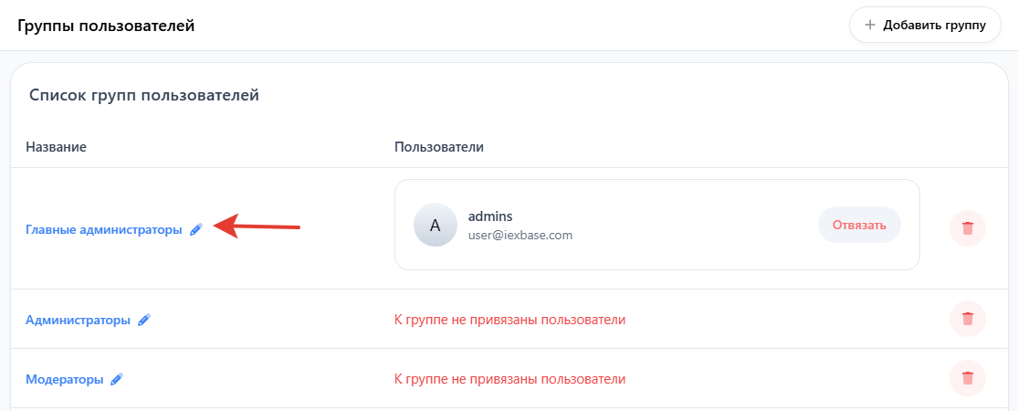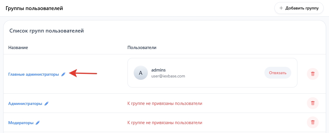 Найдите группу «Главные администраторы» и нажмите на иконку редактирования (✏️), чтобы открыть настройки прав доступа.