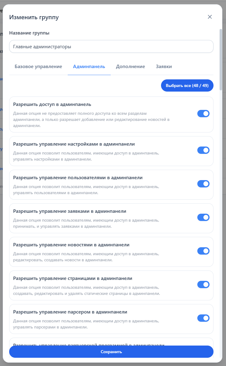 В открывшемся окне переключитесь на вкладки «Базовое управление», «Админпанель», «Дополнение», «Заявки» и включите все необходимые пункты, предоставив полные права главному администратору. Для удобства можно воспользоваться кнопкой «Выбрать все».