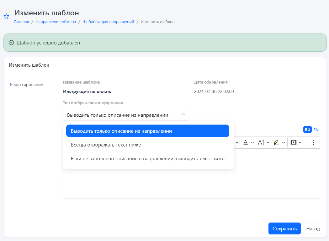 Выводить только описание из направлений — отображается индивидуально из каждого направления обмена. (если ничего не указано, то и отображаться ничего не будет)