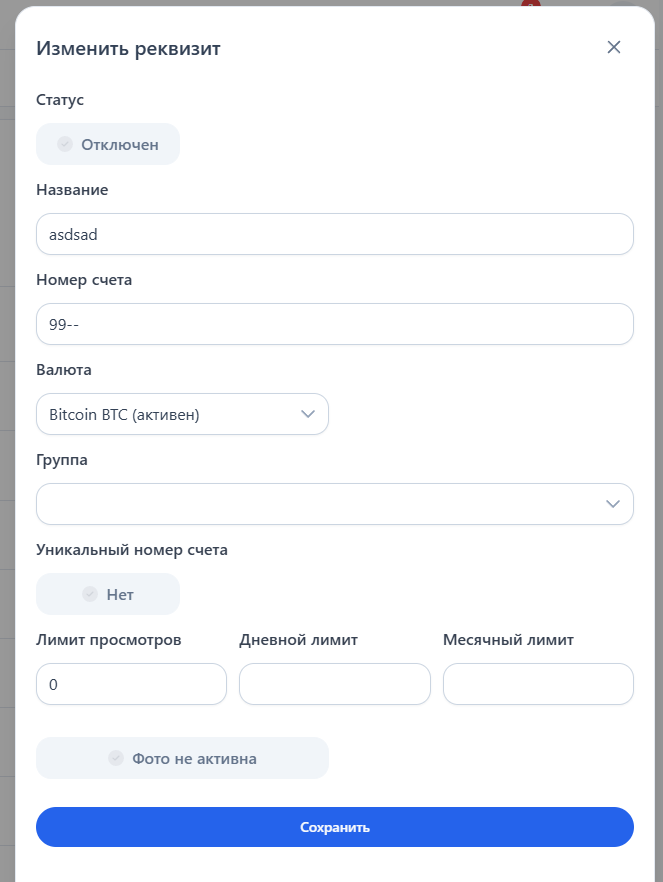 Валюта — выберите валюту, для которого хотите добавить реквизит