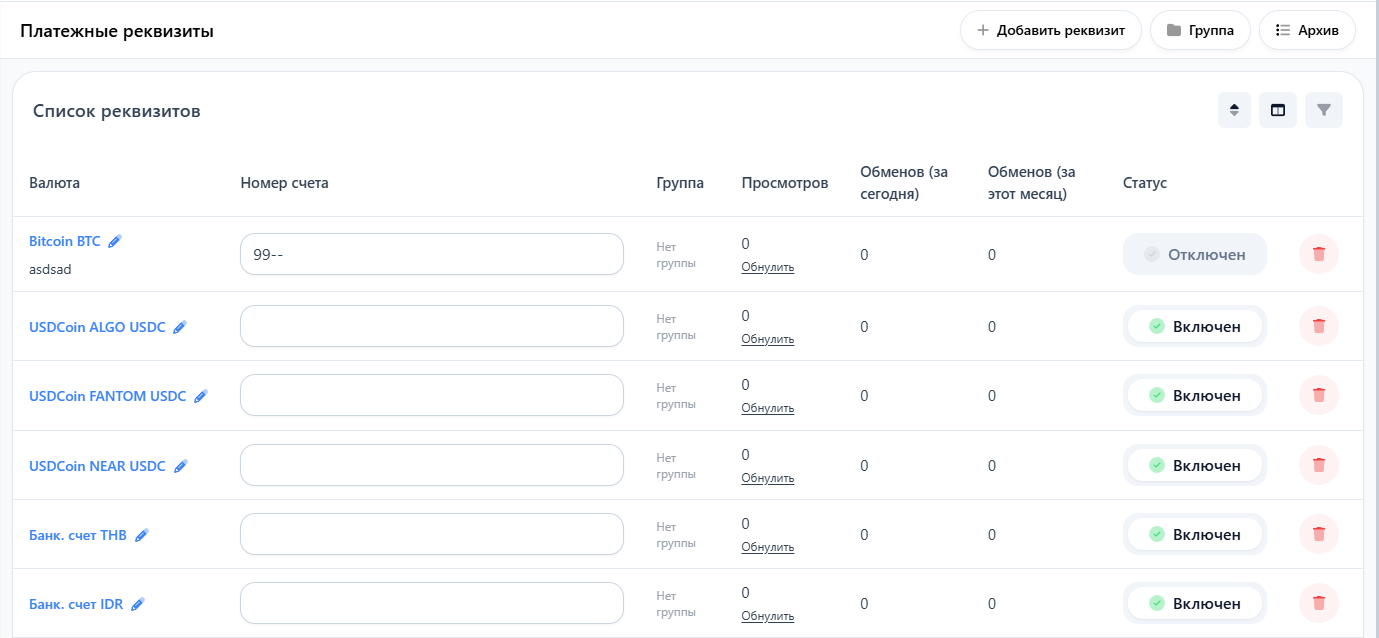 Для работы с платежными реквизитами, откройте раздел "Основное — Платежные реквизиты — Список реквизитов".