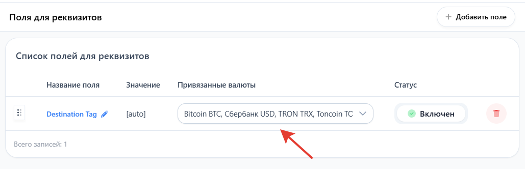 Теперь, необходимо привязать созданное поле к валюте, для этого в списке доп. полей для реквизитов в колонке "Привязанные валюты" выберите необходимые