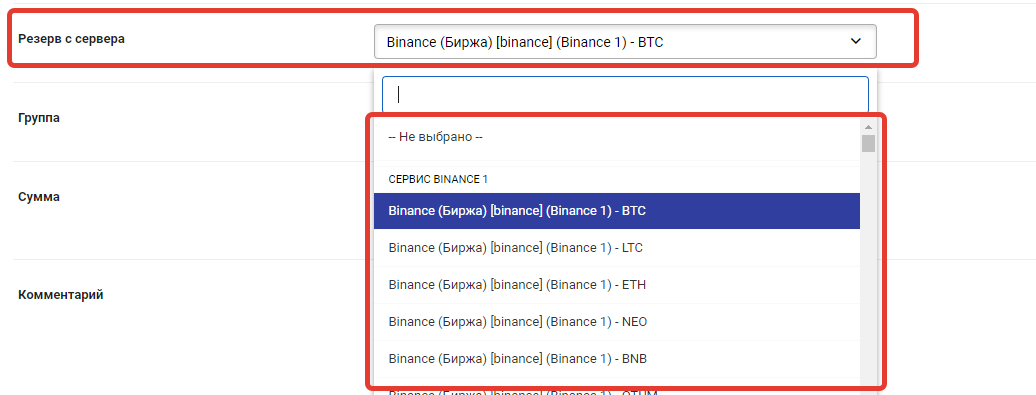 В блоке Резерв с сервера, выберите код валюты, которую хотите подключить.