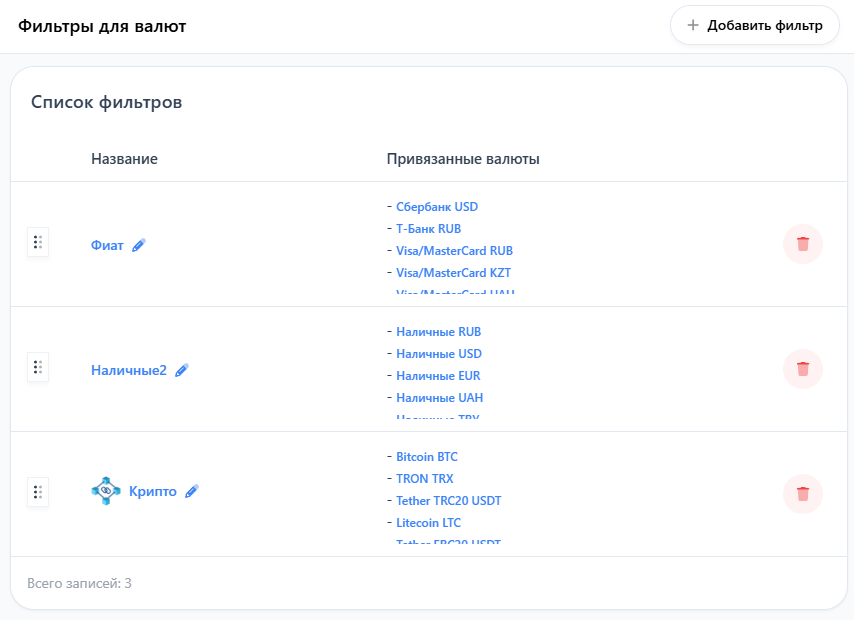 Здесь отображается список всех созданных фильтров и привязанных к ним валют.