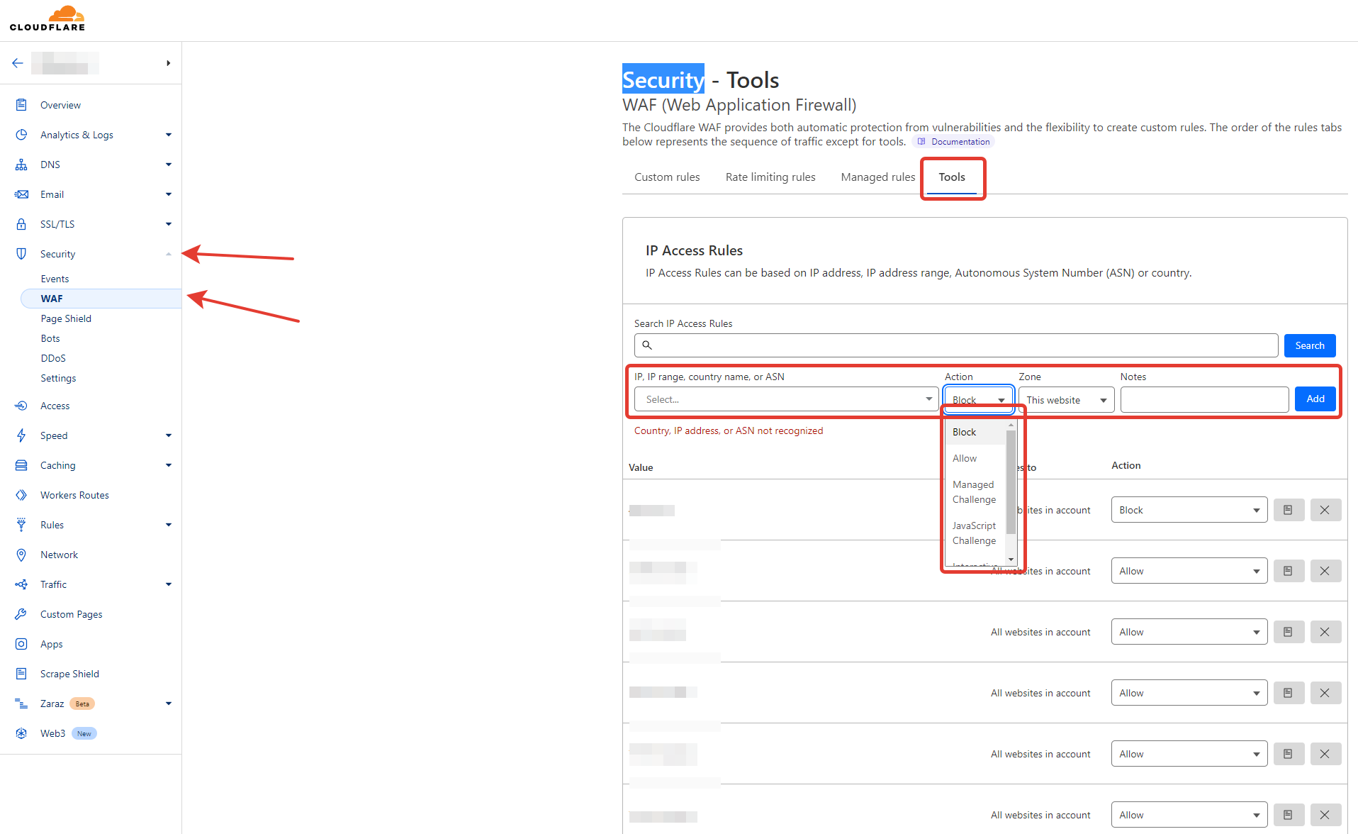 Далее, для настройки Firewall, перейдите в раздел "Security - WAF" и откройте вкладку "Tools" для добавления новых записей