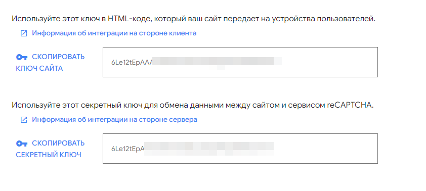 Скопируйте и вставьте в эти поля соответствующие ключи, полученные при регистрации в Google reCAPTCHA v2.