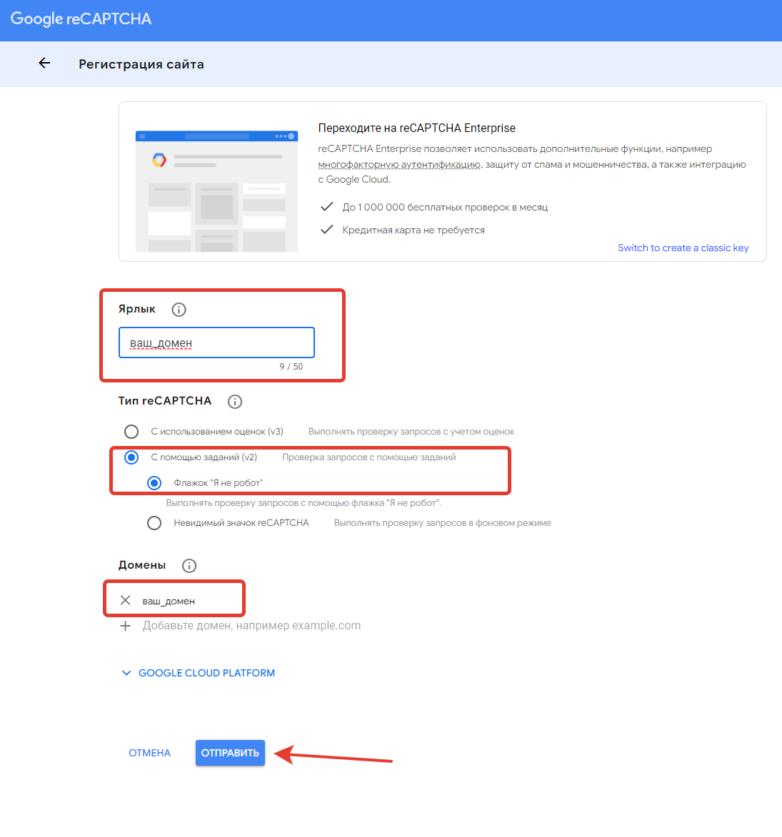 example.com). Можно указать несколько доменов.Примите условия использования, поставив галочку рядом с пунктом «Принять условия обслуживания reCAPTCHA».