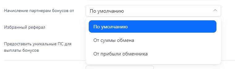В настройках пользователей теперь можно выбрать способ выплаты бонусов партнерам. суммой обмена и от прибыли обменника