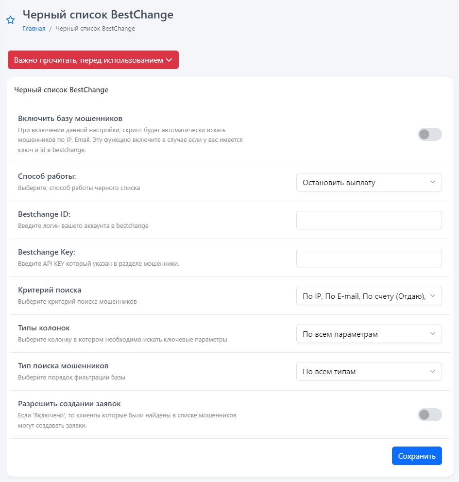 Полностью переработаны Черный список и Черный список BestChange (Добавлена возможность остановки выплаты по заявке, если один или несколько реквизитов клиента находятся в черном списке Bestchange при использовании модуля)
