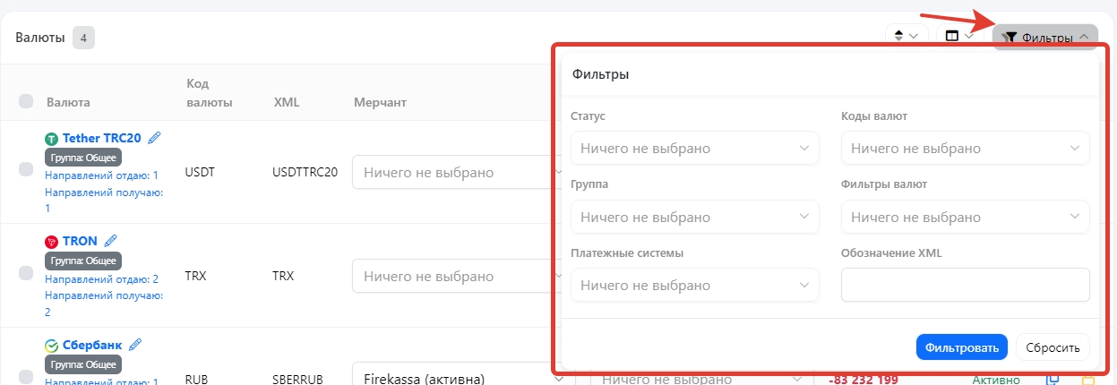 В направлениях обмена, если выбраны мерчанты или выплаты, то они будут подниматься вверх списка