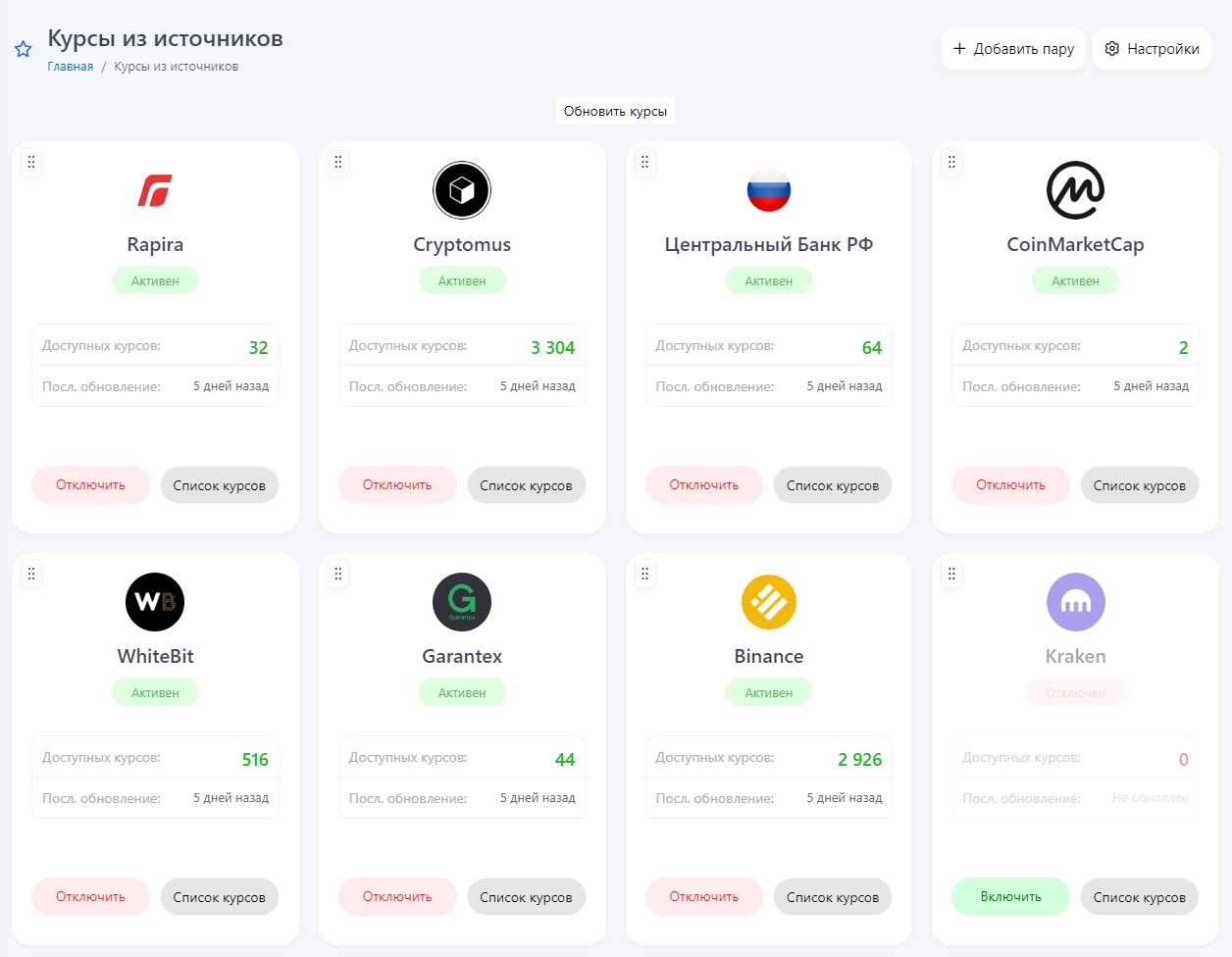 Раздел "Все курсы из источников" теперь можно управлять парами