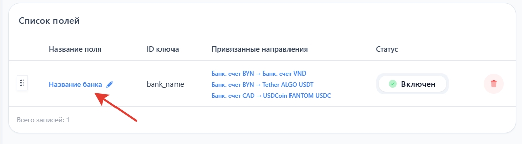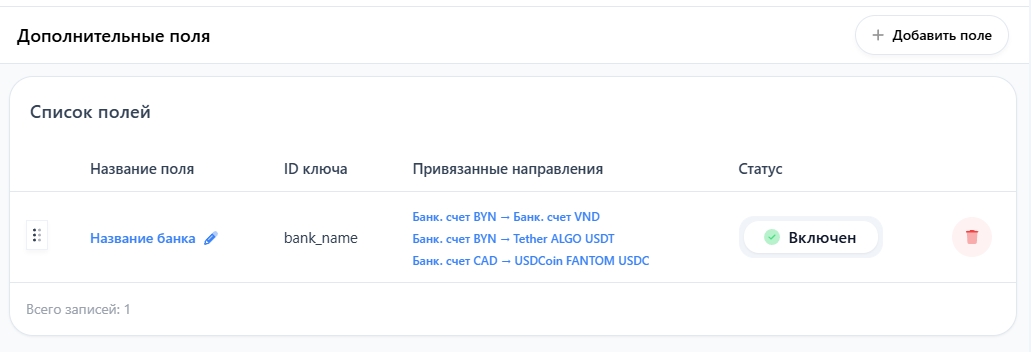 Дополнительные поля для направлений обмена позволяют администраторам собирать специфическую информацию от клиентов для конкретных направлений обмена. Эти поля отличаются от полей для валют тем, что они применяются только для выбранного направления обмена.