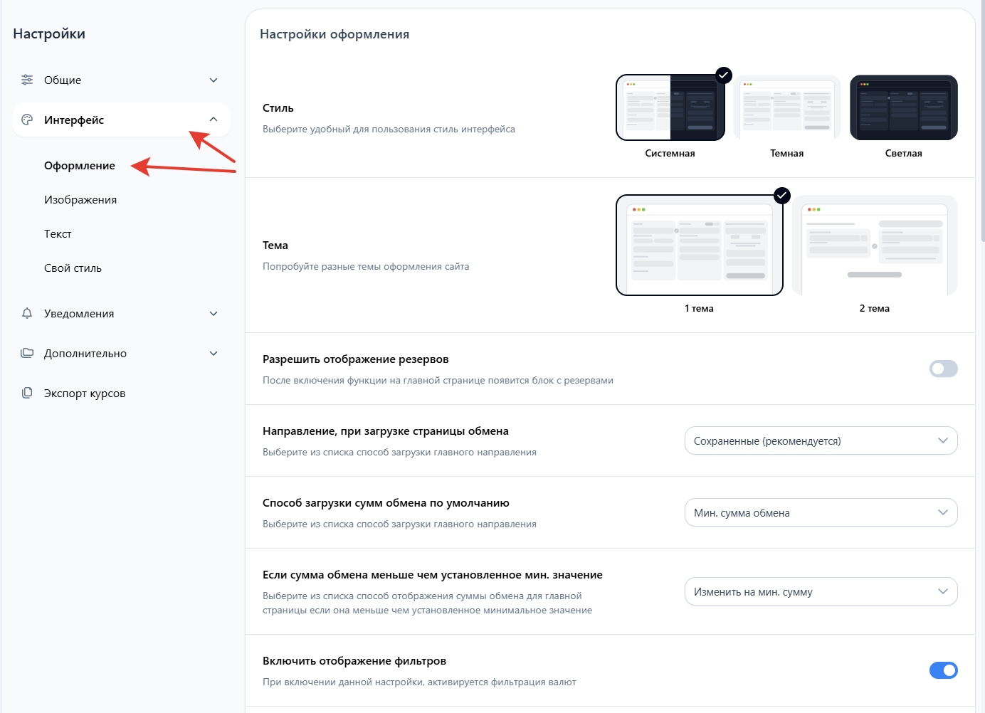 Раздел предназначен для настройки внешнего вида и функционала главной страницы обменного сервиса. Здесь вы можете определять, какие элементы будут доступны и видны клиентам, как именно они будут отображаться, обеспечивая максимально удобное и понятное взаимодействие с вашим обменником.