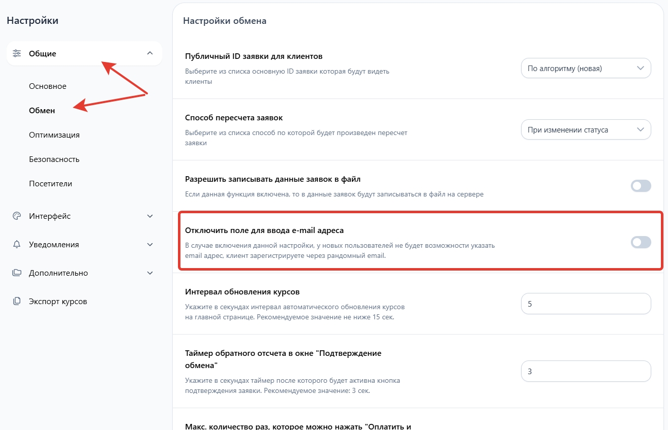 Далее, перейдите во вкладку "Обмен" и включите "Отключить поле для ввода e-mail адреса"