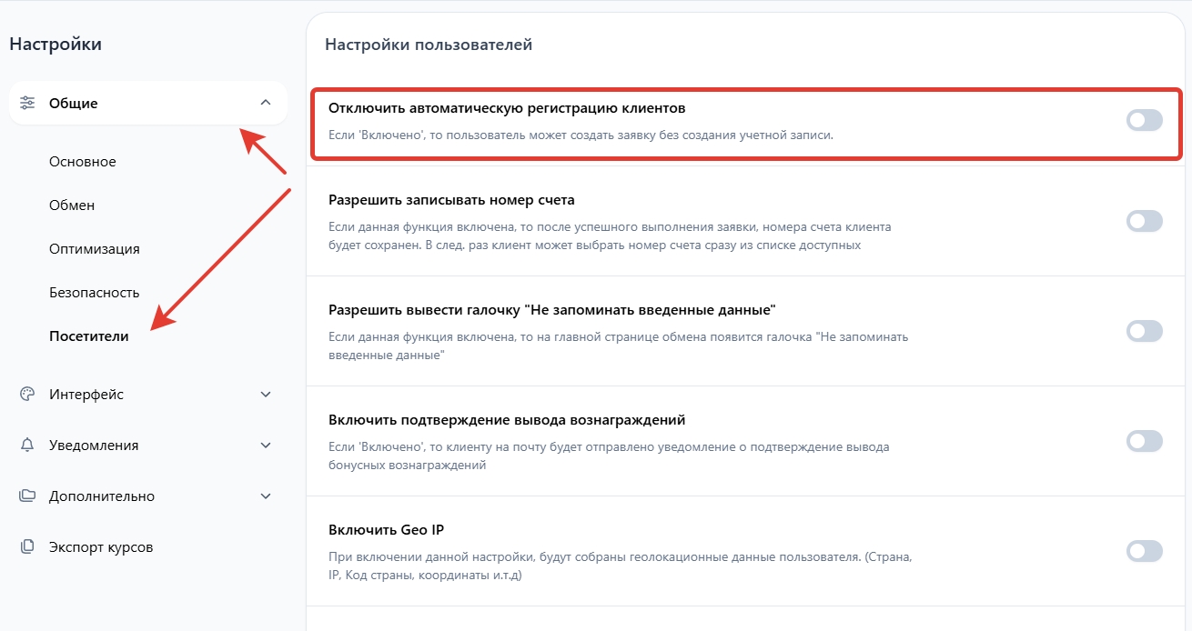 Перейдите в раздел "Посетители" включите функцию "Отключить автоматическую регистрацию клиентов"