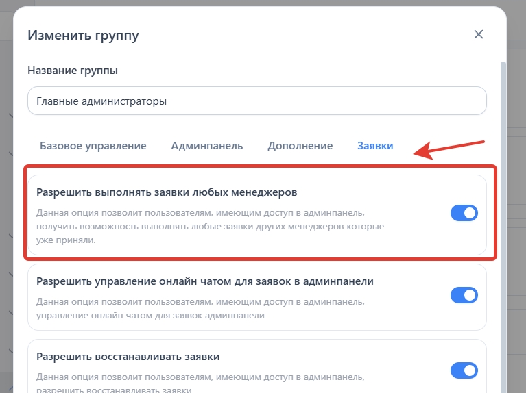 Во вкладке "Заявки" найдите и включите "Разрешить выполнять заявки любых менеджеров"
