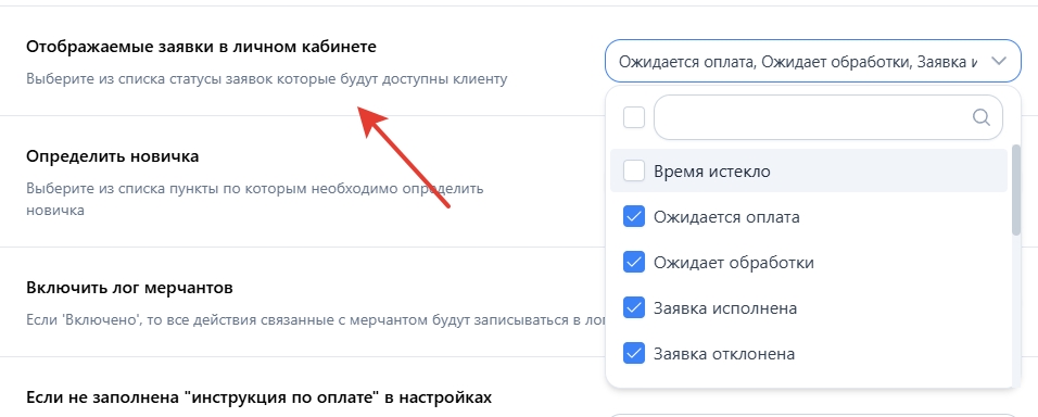 Найдите и выберите в списке "Отображаемые заявки в личном кабинете" статус отображения в личном кабинете клиента.